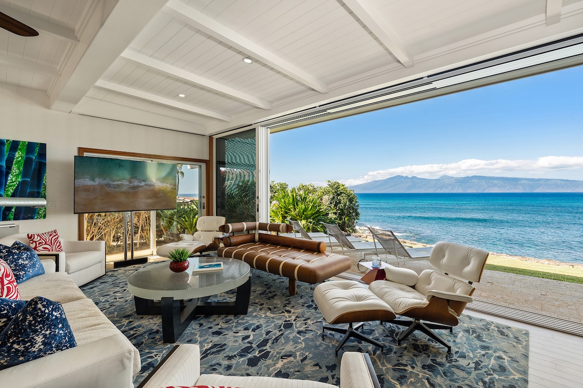 Luxurious oceanfront villa with panoramic Molokai views, private lanai, gourmet kitchen, and spa-inspired master suite-perfect for a relaxing Maui escape with comfort, style, and island charm.