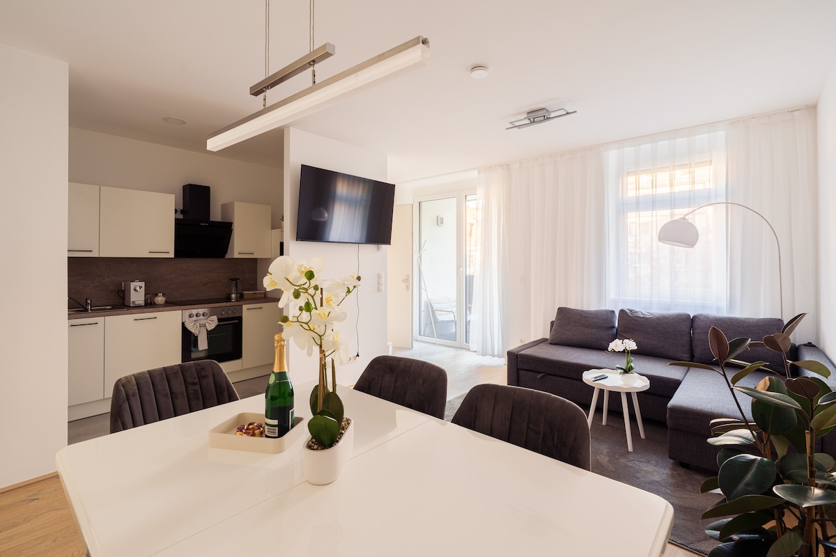 A guaranteed first-class experience with a view of the beautiful Vienna skyline. The luxury 55 m² apartment on the 24th floor with an additional 10m² balcony is designed to make your experience unforgettable. Your stay will include outstanding benefits such as concierge service, open lounge and library, roof top pool, private garden, on-site supermarket and restaurants and direct underground connection to the heart of Vienna in just 10 minutes.