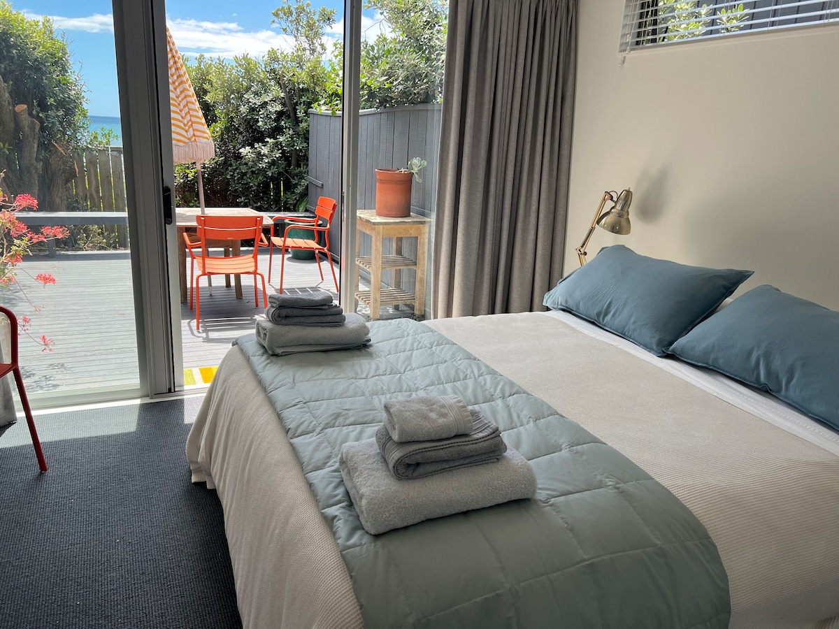 Steps from beach walks and Kapiti Ferry departure point your perfect beachside getaway awaits. Discover a sea view from our sunny and warm studio, nestled privately at the back of our property, offering complete independence and comfort. Enjoy an easy 5 minute stroll to our many restaurant & cafes options. With kitchenette, 50in smartTV, fast fibre and sunny, fenced private courtyard to relax in after adventures, a perfect base for chilling, work or golf – book with us and come to the beach