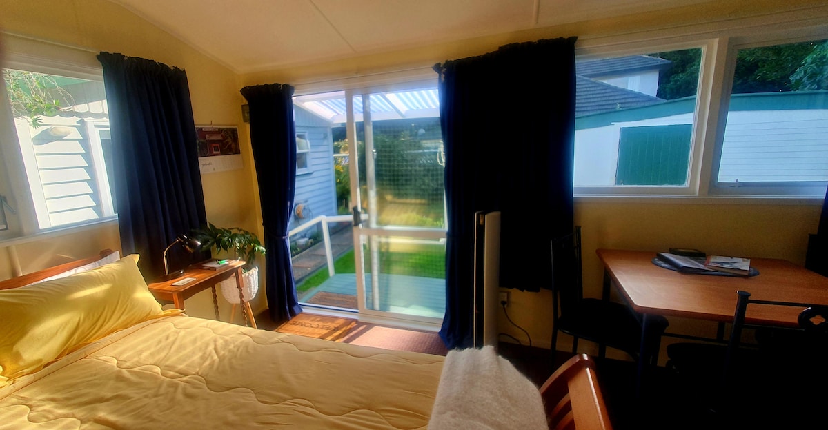 Less than 500 metres to the beach and Raumati village, the studio unit fits 2 people comfortably but can sleep up to 3. A five minute stroll to several cafes and eatery's. Fully self contained with small bathroom and kitchenette. Approximately 40 minutes to Wellington city. You will be welcomed by our friendly and enthusiastic dog who lives in the contained back yard of our place.