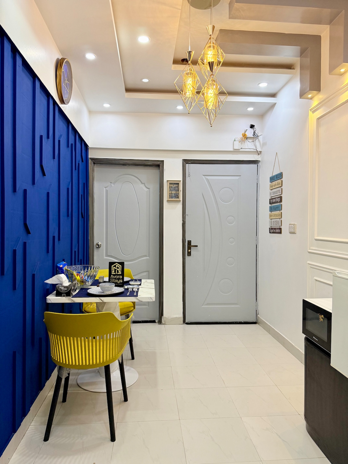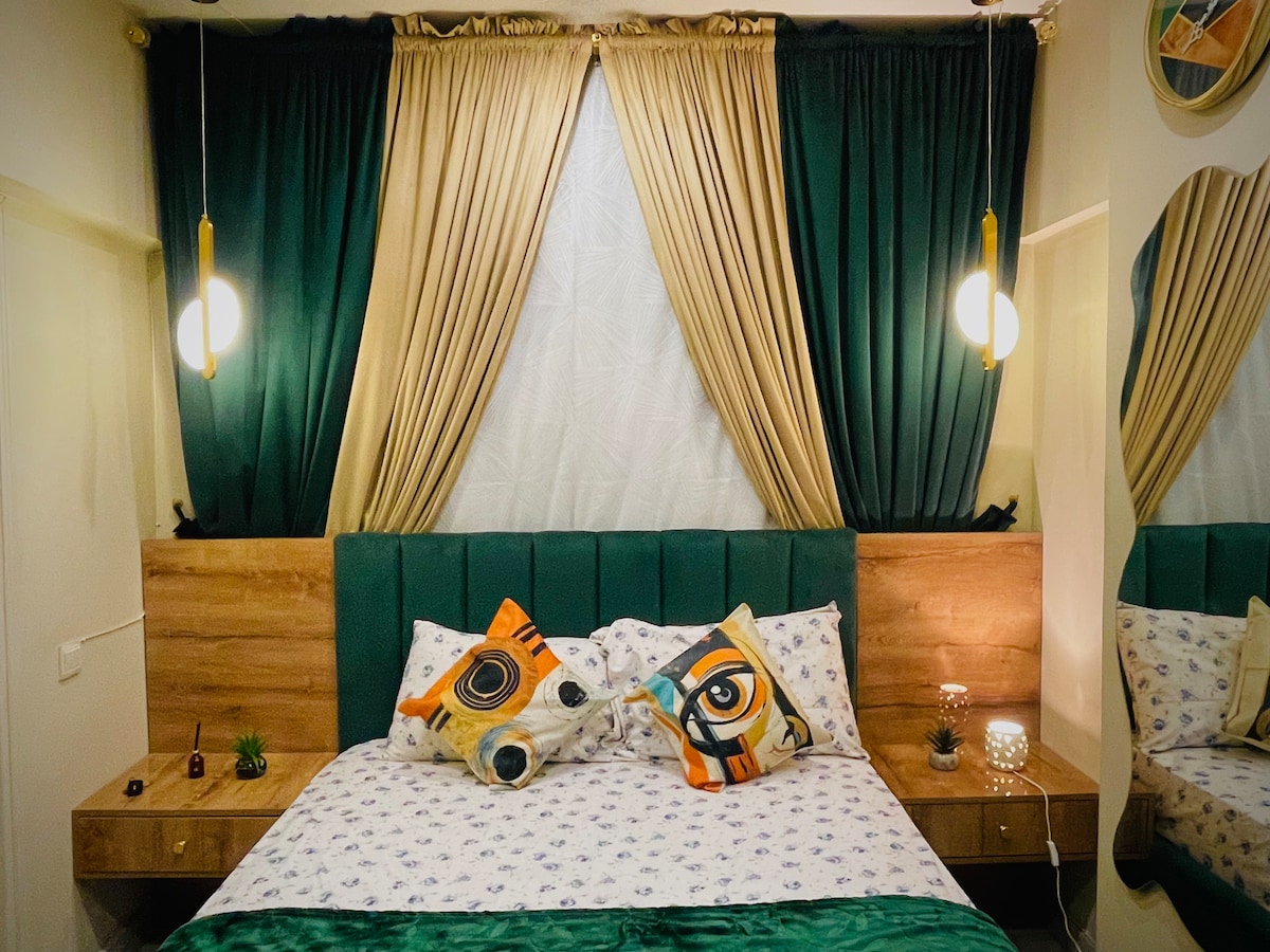 Enjoy this bright, colorful studio in a new building of DHA Phase VI (Small Bukhari) at 2nd floor (without lift). Watch Netflix & YouTube on the smart projector in bed 🎥, or enjoy movies with the LED in the living room 📺. Chill on the velvet sofa 💺, cook in the modern kitchen 🍳, and dine under the arc lamp beside a lovely painting 🎨. Two bathrooms 🚿 mean no waiting. Modern, stylish, and super comfy ✨
