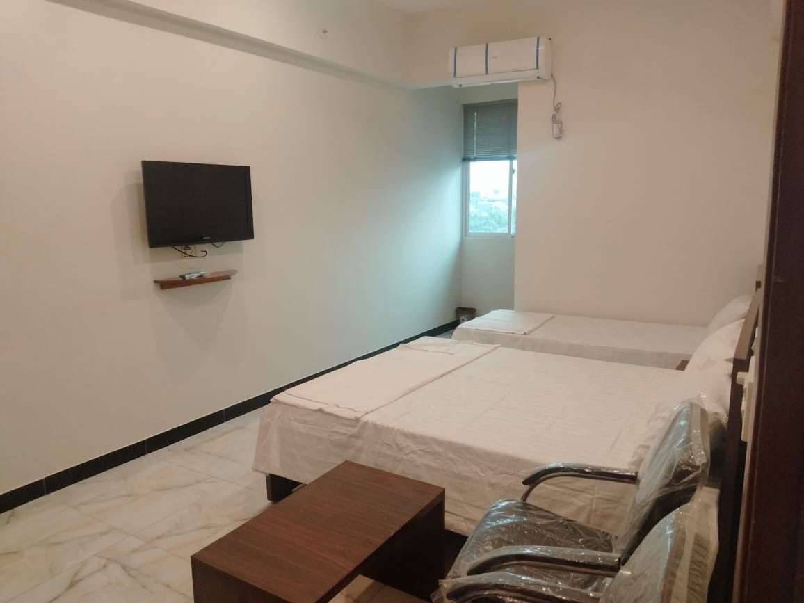 This comfortable double-bed room is ideal for 2-3 guests, offering all the essentials for a relaxing stay. Room Features: Double bed with space for 2-3 guests Convertible table and workspace Hotel Amenities: 24/7 access to the gym Room service Secure Parking Nearby food spots, marts, and hospitals Breakfast & extra mattresses (additional charge) House Rules: No smoking No unmarried couples No alcohol Enjoy your stay in the heart of the city with everything you need just steps away!