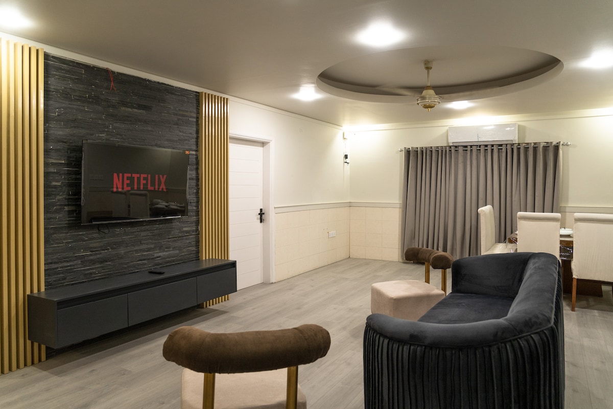 **Harmony Haven:** Our 1BR apartment offers a king-size bed, Wi-Fi, UHD Smart TVs & AC in every room. Centrally located at Shahbaz Commercial & comes with a complete kitchen as well as living room. Safety & privacy on the 1st floor is a surety. Enjoy food delivery, taxis, and extras like coffee, breakfast, and laundry at affordable rates. Nearby, find eateries like Nandos, Sakura and Costa as well as Nice Superstore. Experience comfort and convenience at Harmony Haven – your Karachi retreat