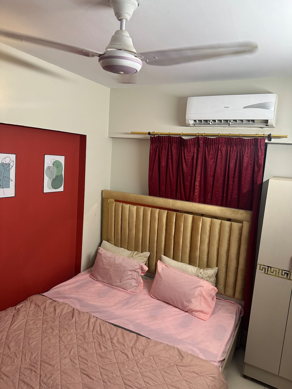 **Harmony Haven:** Our 1BR apartment offers a king-size bed, Wi-Fi, UHD Smart TVs & AC in every room. Centrally located at Shahbaz Commercial & comes with a complete kitchen as well as living room. Safety & privacy on the 1st floor is a surety. Enjoy food delivery, taxis, and extras like coffee, breakfast, and laundry at affordable rates. Nearby, find eateries like Nandos, Sakura and Costa as well as Nice Superstore. Experience comfort and convenience at Harmony Haven – your Karachi retreat