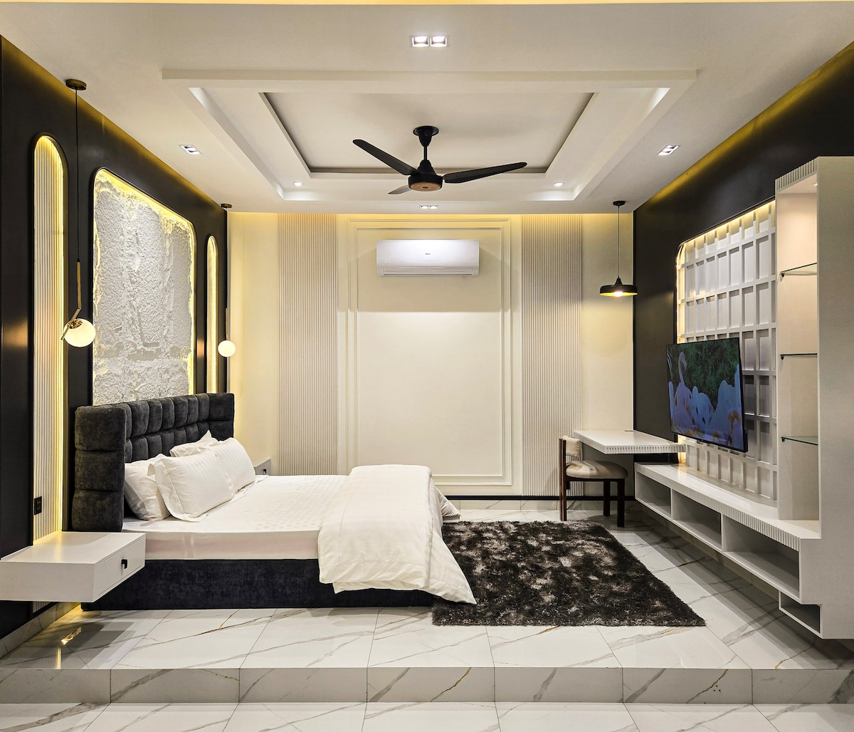 A refined Junior Suite in DHA Phase 8 designed for business travellers who want privacy and a proper work setup. King bed, dedicated workstation, high-speed Wi-Fi, smart TV, minibar/fridge and a luxury interior. 24/7 front office support with secure RFID key-card access at check-in.