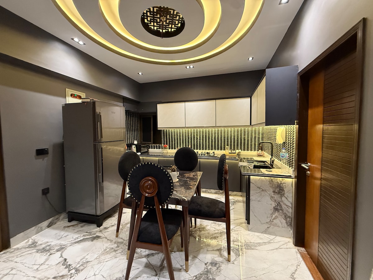 Our apartment offers a comfortable stay in heart of Karachi. A beautiful Decorated perfectly blended. The living room is perfect for relaxation with a sofa and coffee table. You'll find everything you need to cook in the kitchen, including a refrigerator, and basic utensils.The bedroom features a queen-sized bed,1 air conditioning,a TV for entertainment. Enjoy the city views from your private balcony. The bathroom is equipped with essential toiletries. UNMARRIED COUPLES STRICTLY NOT PERMITTED..