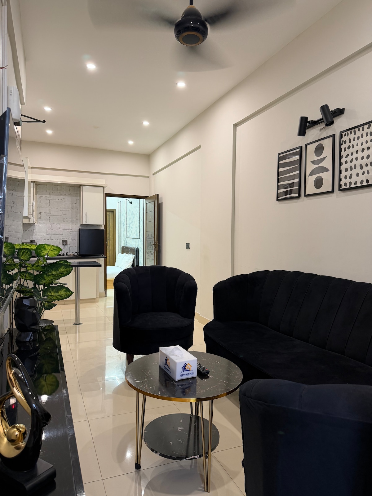 Stay in style at our modern one-bed studio with lounge in DHA Phase 7 Extension, near Suffa University! Designed for comfort and convenience, it’s perfect for corporate guests, or families, hosting up to 3. Enjoy AC, TV, fridge, oven, wifi, iron, and hair dryer. Secure parking, guard, and CCTV ensure peace of mind. Laundry and breakfast available on request. This apartment offers the perfect mix of comfort, safety, and premium living! 🪪 CNIC/Passport mandatory for check-in.
