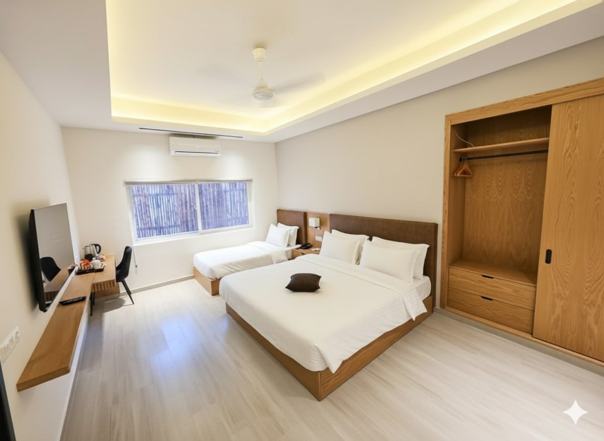 This comfortable double-bed room is ideal for 2-3 guests, offering all the essentials for a relaxing stay. Room Features: Double bed with space for 2-3 guests Convertible table and workspace Hotel Amenities: 24/7 access to the gym Room service Secure Parking Nearby food spots, marts, and hospitals Breakfast & extra mattresses (additional charge) House Rules: No smoking No unmarried couples No alcohol Enjoy your stay in the heart of the city with everything you need just steps away!