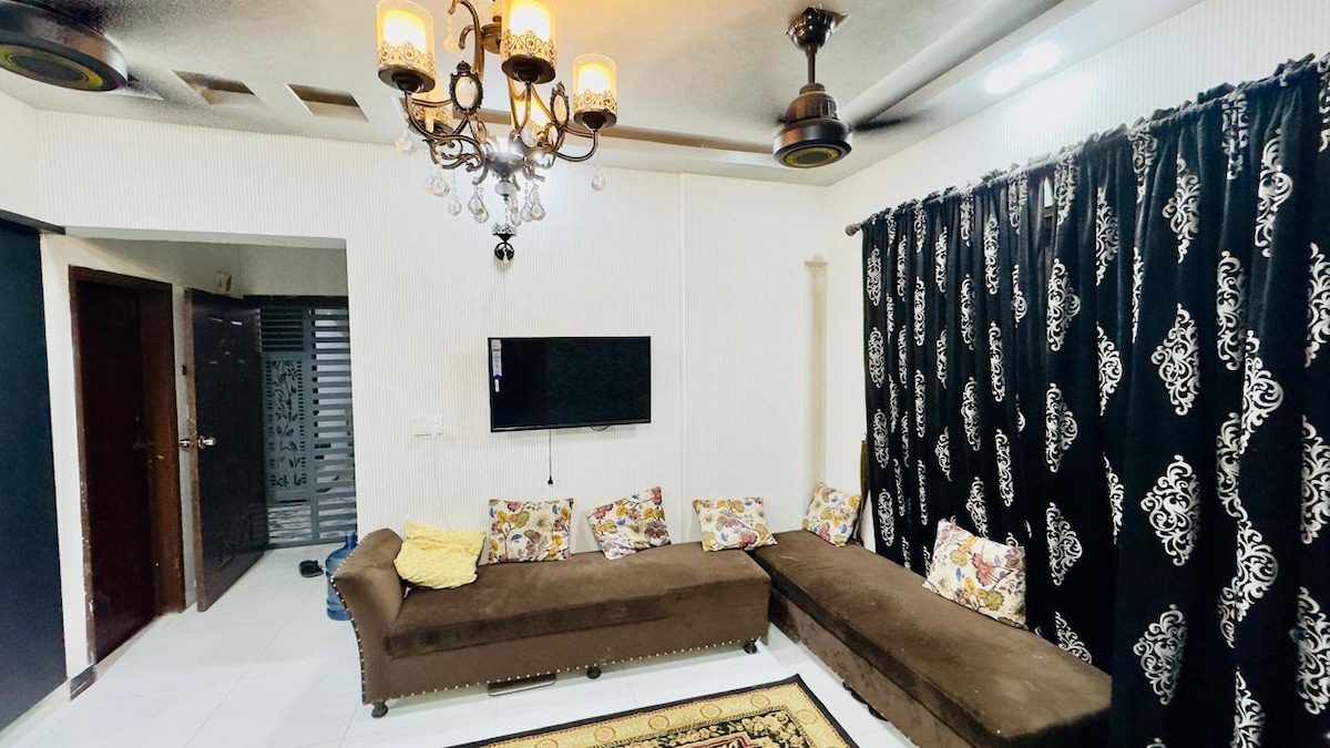 Stay in a modern 2-bedroom apartment on Shahrae Pakistan, FB Area / Gulberg, Karachi, close to Gulshan-e-Iqbal, North Nazimabad, and major shopping & food streets. Featuring a bright, airy design with a fully equipped kitchen, spacious lounge with 65" Smart TV, and a large green balcony with BBQ seating, this home is perfect for families, groups, and business travelers. Conveniently located near Aga Khan Jamatkhana at Karimabad, supermarkets, and National Highway access.