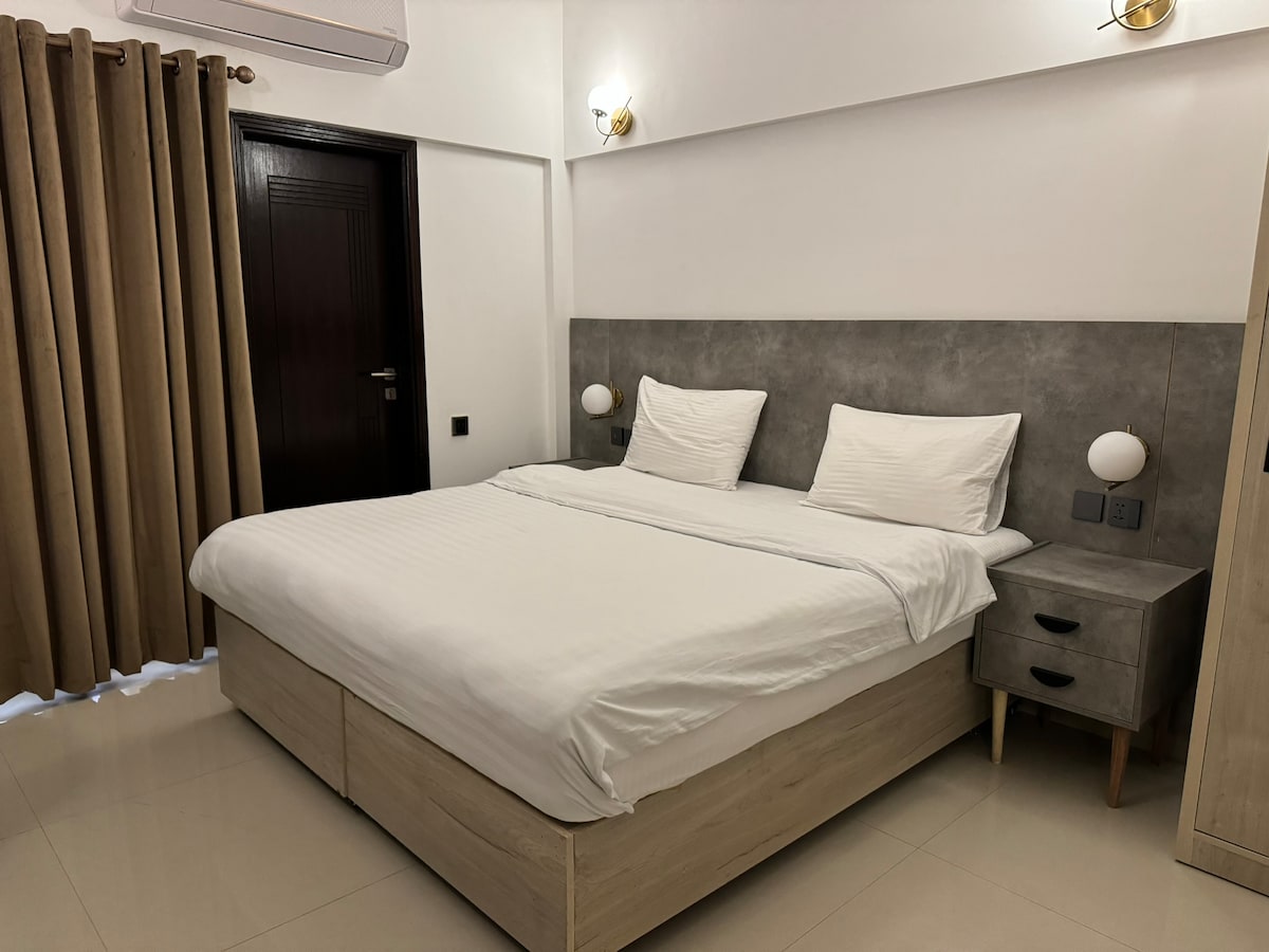2BR apartment nestled in the heart of Karachi's vibrant city center. Each bedroom is a haven of comfort with plush bedding .The open-plan living area is a perfect blend of modernity and warmth,, fully-equipped kitchen. With local shops and eateries just a stone's throw away, this apartment is not just a living space but a gateway to the rich culture and energy of Karachi. It's the perfect urban retreat for anyone looking to soak in the city's dynamic spirit! How does that sound? 🏙✨