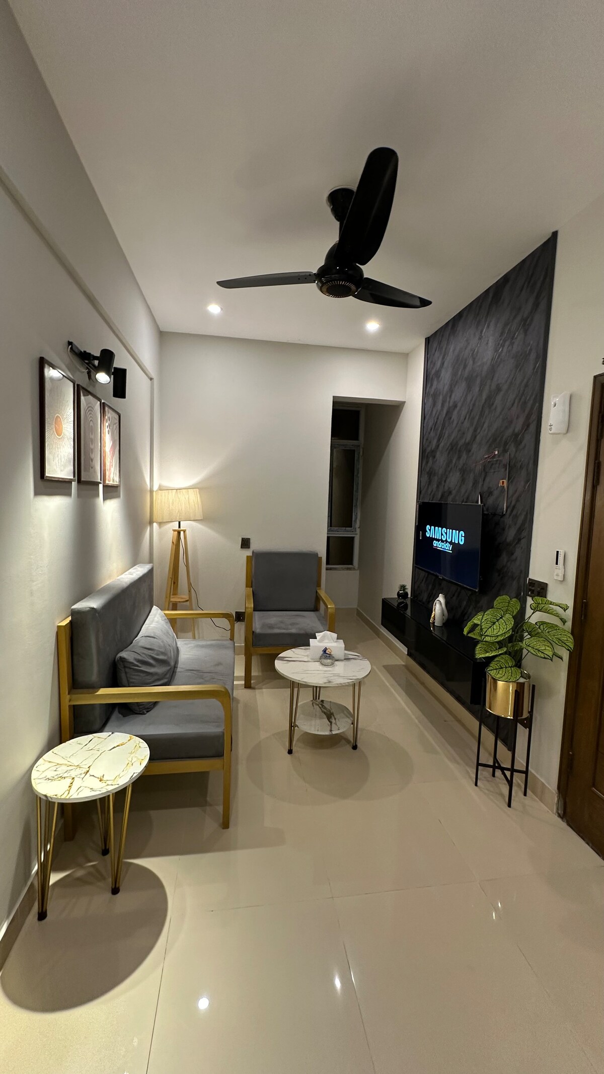 Unmarried couples are strictly not allowed. Modern open-layout NOX Studio featuring a king bed, cozy sofa, chilled AC, and chic wooden & raw design accents. Relax with a Smart TV, Wifi and Refrigerator. Spacious washroom with an open wardrobe. Perfect for small families, friends, travelers or couples seeking comfort and style. Located in a secure building, close to shops, mosque, and banks combining modern aesthetics with convenience for a memorable stay.