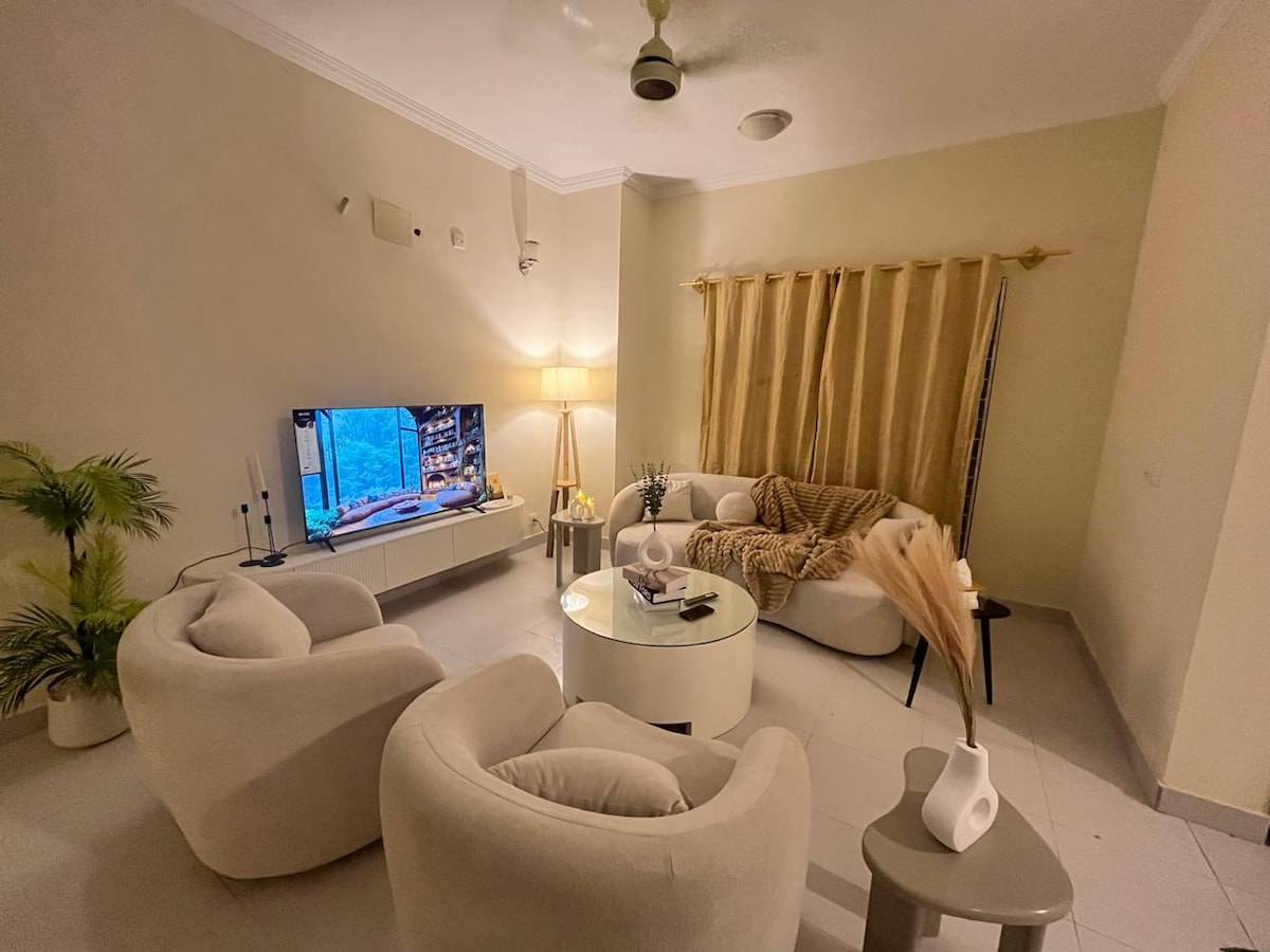 Experience peaceful & secure living in our elegant apartment in Phase VIII, DHA Karachi, 2 mins from sea & 9 mins from Dolmen Mall & upscale dining. Enjoy the convenience of free daily cleaning & housekeeping. Car & driver & food service (on extra fee) available on request. Our spacious living areas, modern kitchen, and beautifully designed bedrooms with en-suite bathrooms with back up generator ensure a memorable stay. Perfect for families & business travelers, offering high-speed Wi-Fi.
