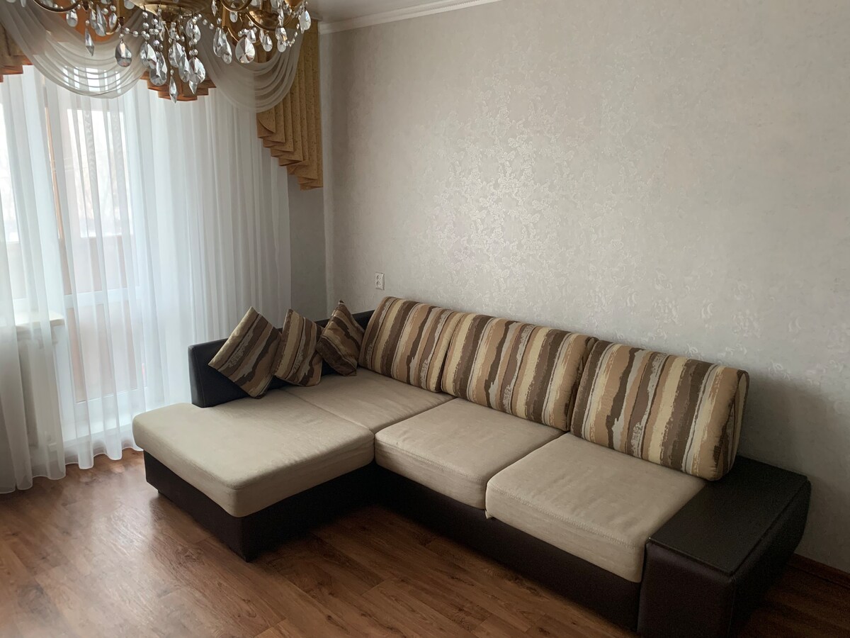 Квартира находится в центре города, в тихом и спокойном районе. Рядом — Центральный парк и парк с мемориалом «Вечный огонь». Просторная однокомнатная квартира оснащена всем необходимым для комфортного проживания и отдыха.