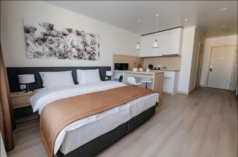 Просторная студия Space Apart Astana С3А с балконом, площадью 42 кв.м, на 2 этаже в ЖК Нурсая, возле монумента Байтерек. Оборудована всем необходимым для проживания: от комфортной спальной зоны с ТВ и Wi-Fi, ванной комнаты со стиральной машиной и собственной кухней с необходимой бытовой техникой до посуды, постельных принадлежностей и махровых полотенец.