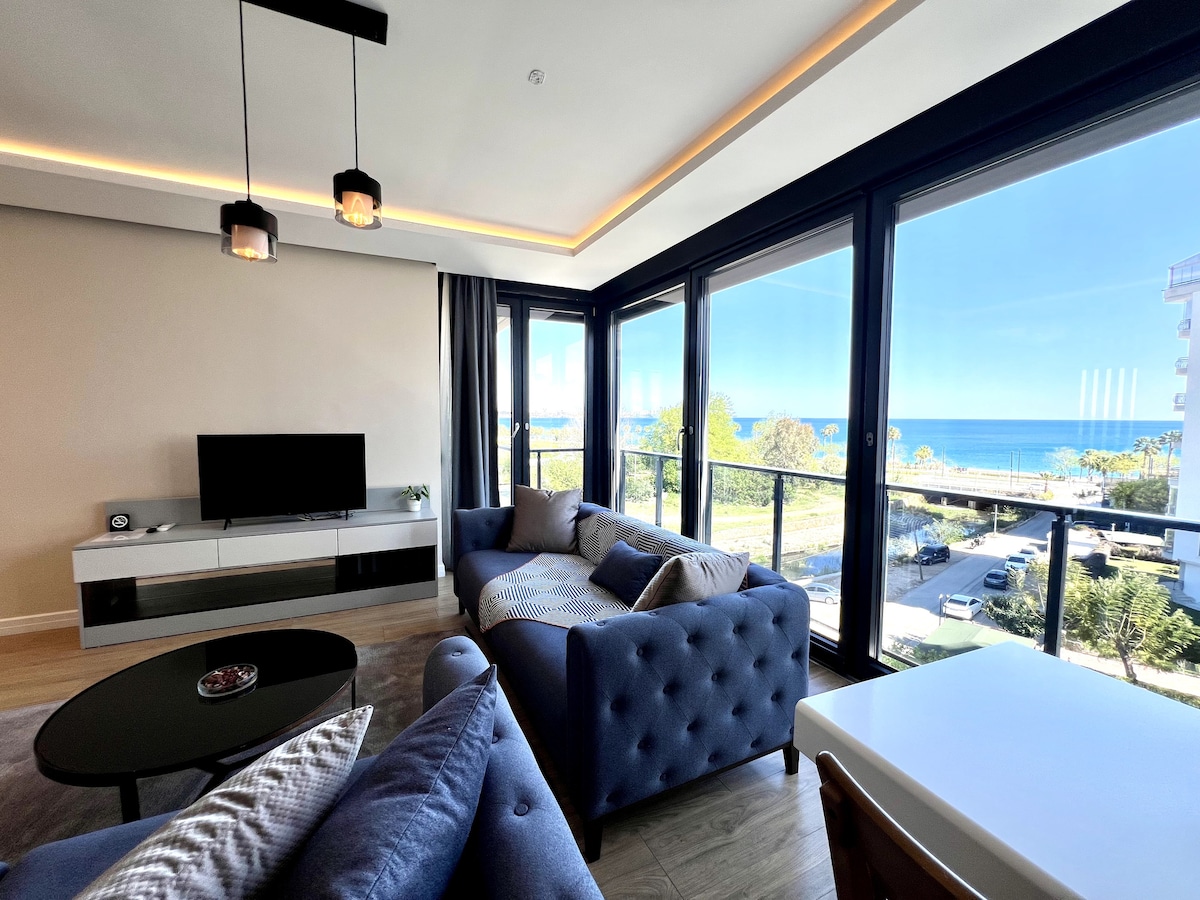 Vera Suites at the center of Konyaaltı. You can reach to sea by walk in 2 minutes. Restaurants, Beach Park, Shopping mall also close to our suites. Our flats are completely sea view. The flat has 2 bedrooms and 4 or 5 people can easily stay. P.s: Sofas also can be bed. -We can add an extra bed to the second bedroom. -We provide free weekly cleaning for more than 5 days reservation. -We have a reception and a security service 24 hours. You can reach us any time with every request.
