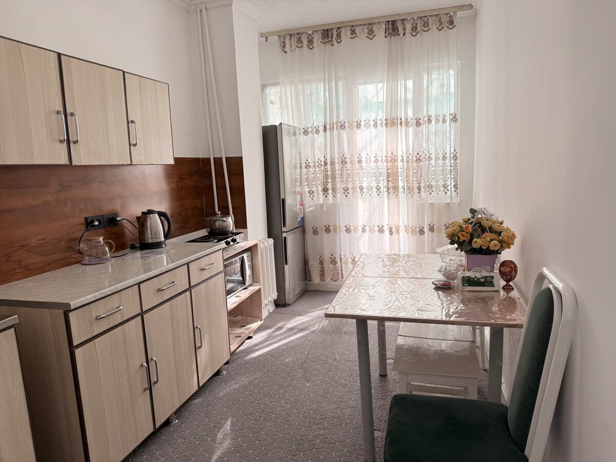 Welcome to our flat in the center of Karakol located in the centre of the town. We can meet you in the bus station and bring you. Please don't hesitate to ask any question I will support you while booking Our flat is the forth floor of the 5 floor building. There is a hall, a living-room, two bedrooms, a kitchen, a bathroom with shower, a toilet and a balcony in our flat. Our kitchen is not very large. Apartments is equipped with WIFI and television offers a choice of about 60 channels.