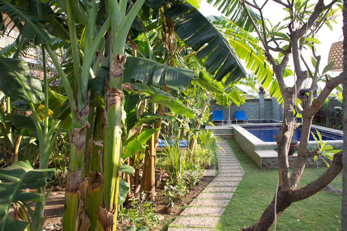 私人三室的房子与一个共享的游泳池。小组合或家庭的理想选择。山脉和热带花园是华丽的。这是一个很棒的位置来探索Amed地区-水肺潜水、海滩和浮潜。