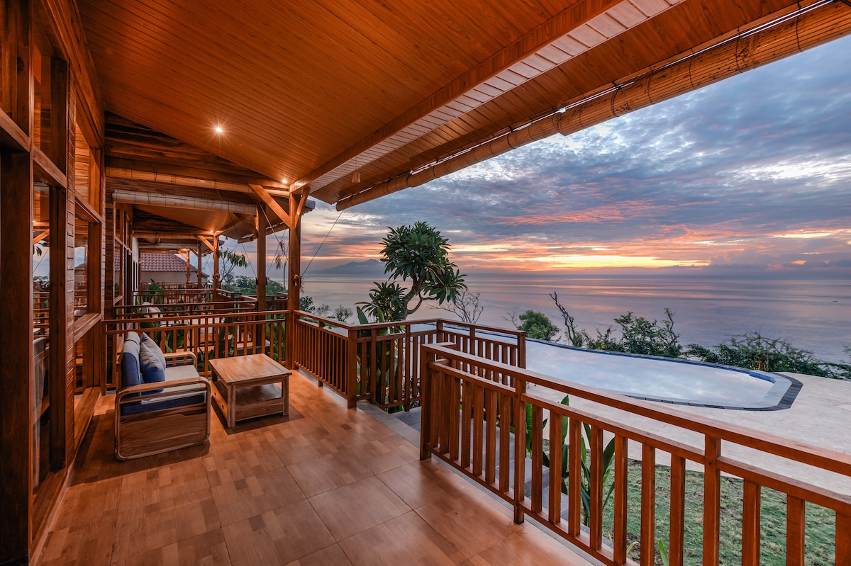 Unique Stay in the North With a total of 2 buildings, 1 shared pool and restaurant area this boutique stay has 7 luxury designed bedrooms . Four of them are 70 sqm Suite rooms and composed the main Joglo and has a shared living room. Two rooms are looking the sea, sunrise and sunset view and 2 other rooms looking to Mont Agung. In the second building you will find a restaurant in the first floor and 3 50 sqm deluxe room with sea view on the second floor, a private bathroom and terrace.