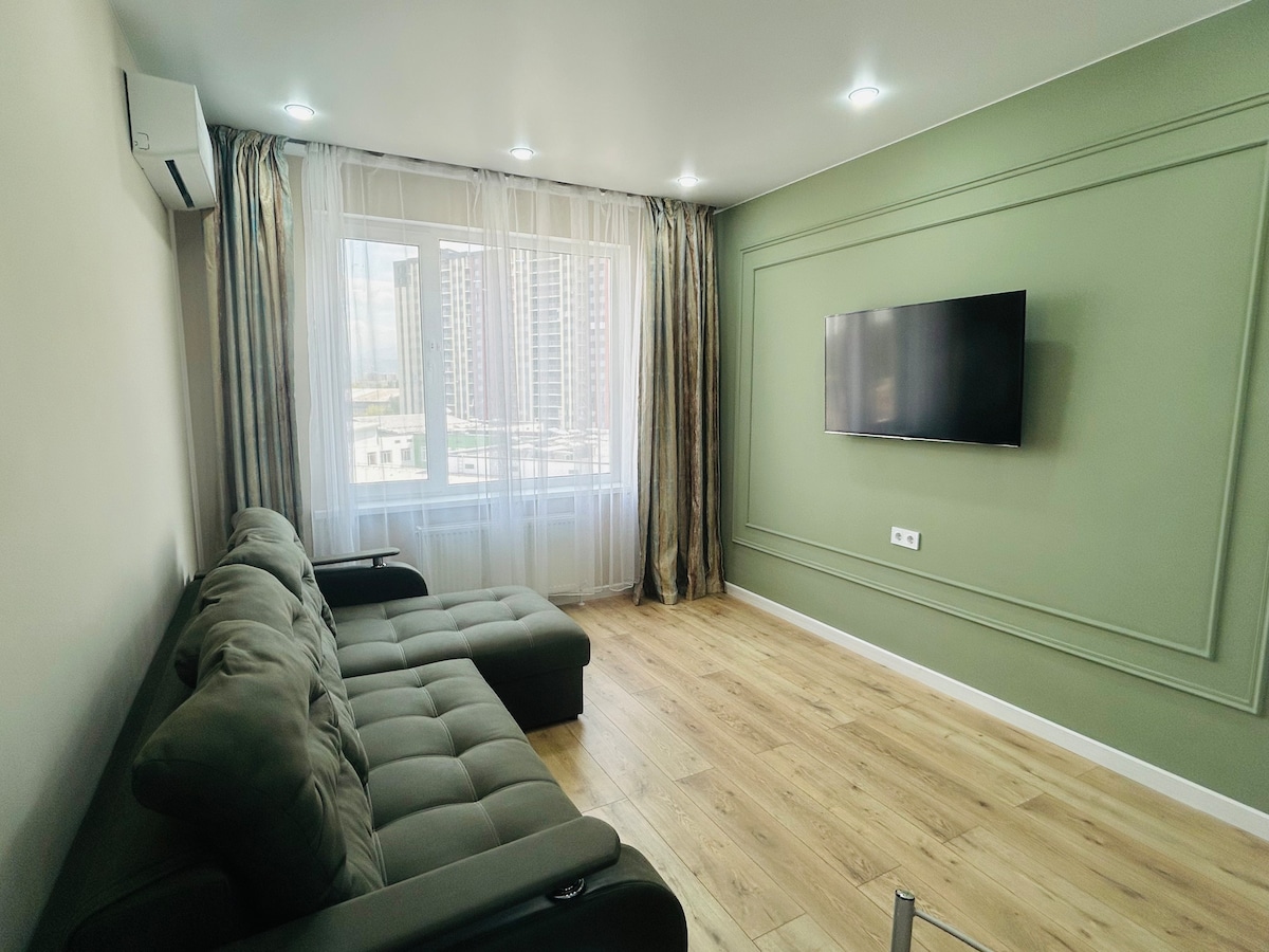 Welcome to your ideal stay in Almaty! Enjoy breathtaking mountain and city views right from your window. -7 minutes to Metro Station -сomfortable bed and cozy sofa -fully equipped kitchen -modern bathroom with fresh towels and toiletries - Wi-Fi and SmartTV The apartment is located in a safe and lively district, close to cafés, supermarkets, pharmacies, shopping malls! Self-check-in available Always ready to assist you — feel free to message any time. Relax, explore, feel at home!