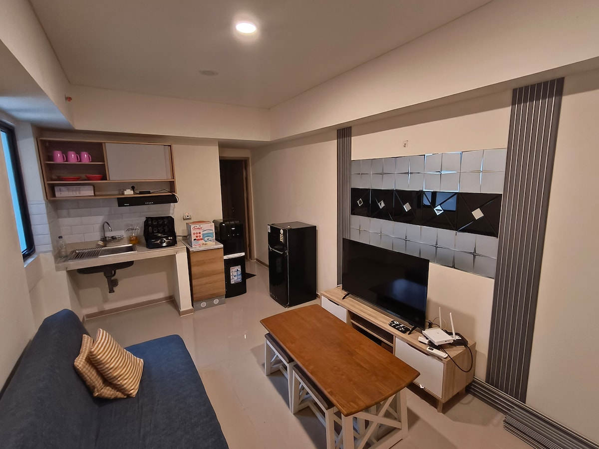 Apt 2 kamar dengan: 1. Kamar utama dgn kasur queen size (160x200) , sprei, selimut & lemari baju besi full kaca 2. Ruang serbaguna dgn sofa bed kulit (107x180) & meja . Ruang tamu ada sofa bed kulit (107x180) dan tv 40", rak tv. AC, bantal ada di semua ruangan. Kamar mandi ada water heater. Dapur ada kompor listrik, utensil, kulkas Balcony ada mesin cuci mini & jemuran. Cukup jalan kaki (+-200m) ke food court 24hr, cafe, toko sembako, laundry Luas 42m.