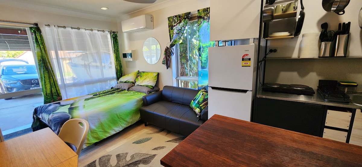 MSG HOST 1ST. PVT GATE ENTRANCE. MODERN PRIVATE STUDIO UNIT: Facilities include: -Fridge/freezer&Microwave -Toaster&Electric Jug,Airfryer -Dishes,Cutlery, Cups,Glasses,Utensils Qu Bed,ensuite/separate toilet,roofed deck/courtyard. Lots of choices for restaurants & takeaways nearby 2 mins drive. Leafy,quiet suburb near park,Buses,Mall(5mins)Quick access all motorways-City, Gold Coast,Sunshine Coast & Western. Approx 25 mins to Dreamworld, Movieworld, Wet'nWild.