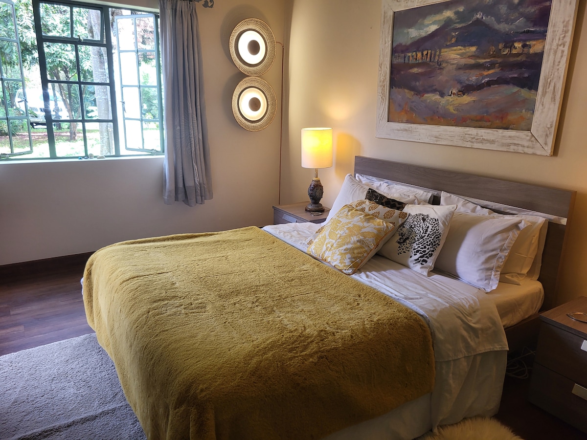 Situated in the heart of the leafy suburb of Karen; this stylish one-bedroom A-frame cottage is tucked away out of sight in a corner of our four acre garden. Ideal for solo travellers and couples. Not suitable for guests with mobility issues. Young children aren’t permitted due to the steep staircase. The property is located less than 1.5km from the Hub Mall and only 2km from the Karen centre.