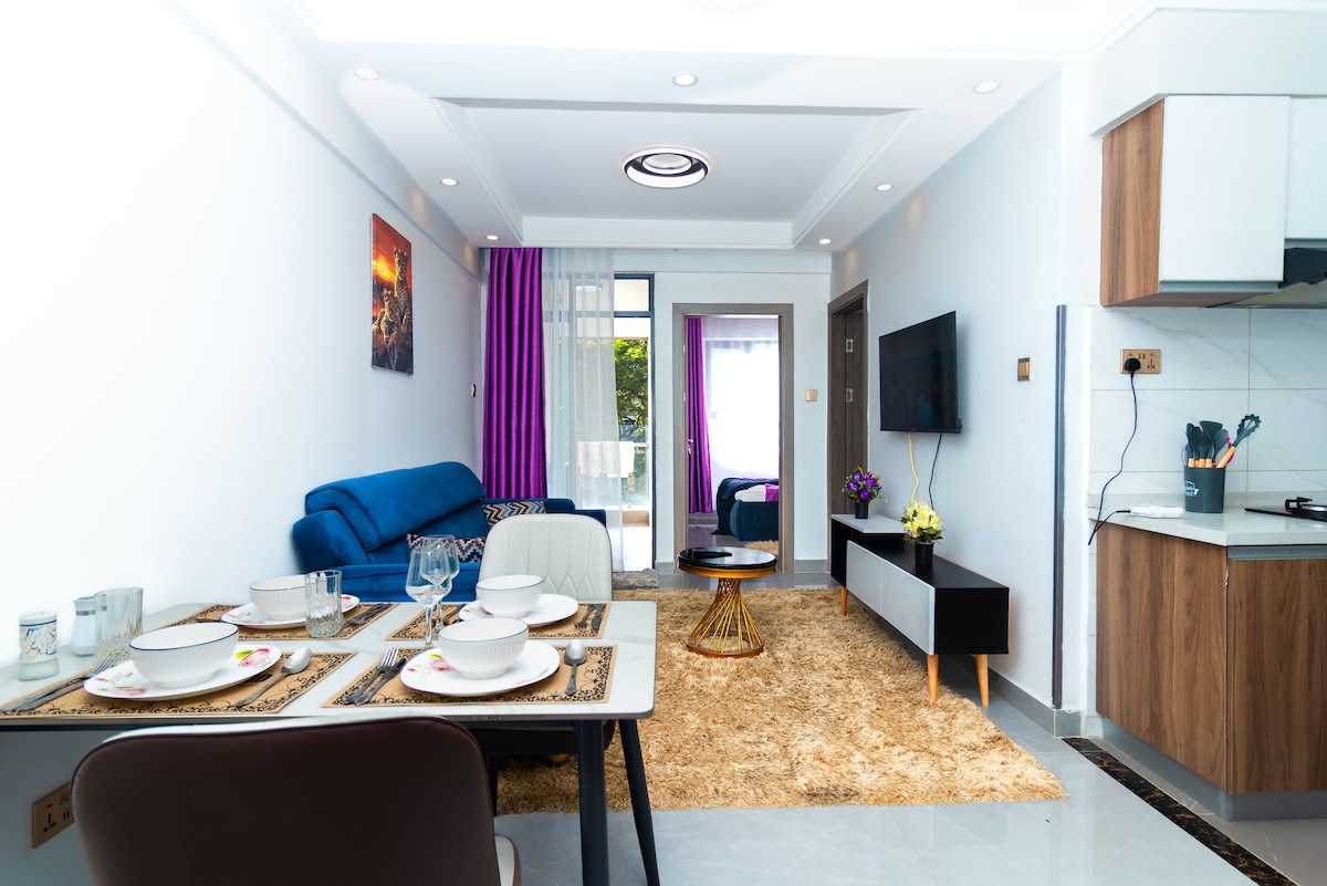 This entire stylish apartment is modern, spacious & comfortable, with one bedroom & en-suite bathroom, luxurious King size bed, eloquent dining room, bedroom & lounge Netflix-TV, balcony, kitchen and washing machine area. All amenities provided, including unlimited Fast WiFi and business facilities. Situated in a quiet leafy suburb, but also conveniently close to Westgate, Sarit and Lavington shopping malls, restaurants, business hubs, CBD and few meters walk away from Westlands nightlife.