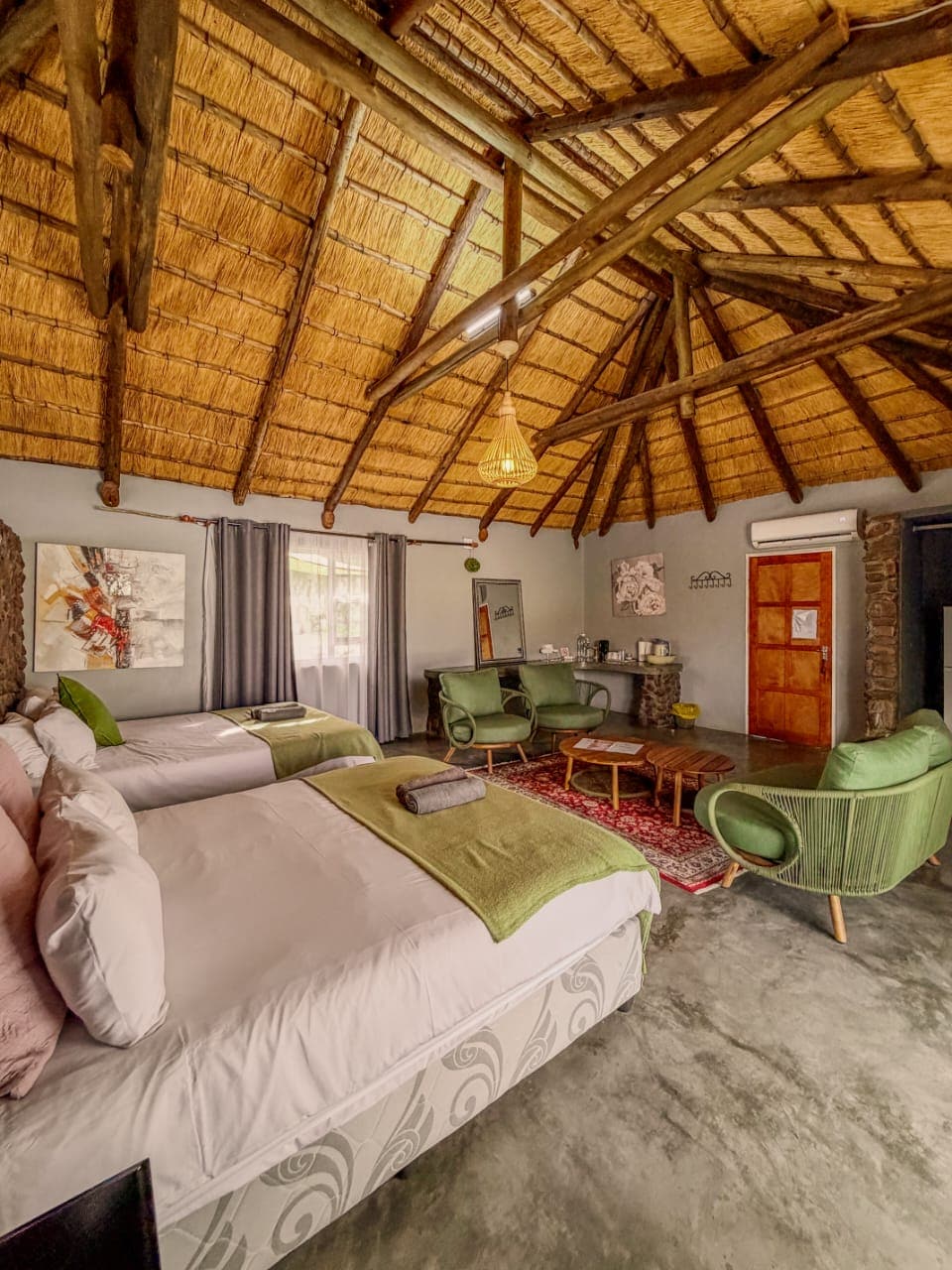 Wake up to breathtaking sunrises over the Erongo Mountains in the Quartz Suite, where a fresh green theme brings nature indoors. This one-bedroom retreat combines comfort with style, featuring a modern kitchen, cozy lounge, and private bathroom. Step onto your balcony for morning coffee, unwind in the braai area, or enjoy peaceful evenings with free Wi-Fi. Whether you’re here for work or leisure, the Quartz Suite offers the perfect blend of relaxation and convenience in the heart of Karibib.
