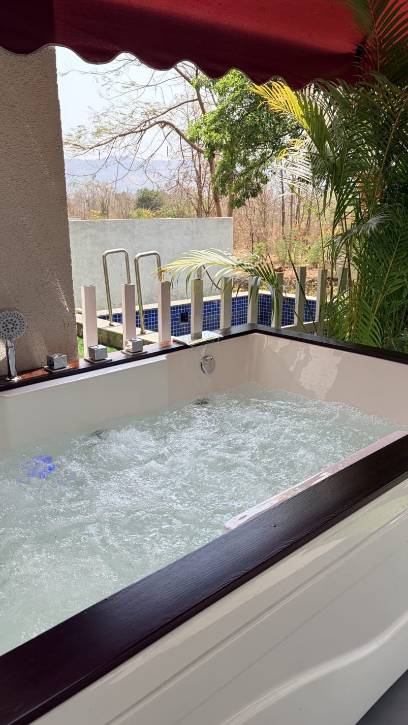 Relax at Tej Villa, a peaceful 3BHK luxury villa near Karjat featuring a private outdoor Jacuzzi, lush garden, and beautiful mountain views. Perfect for families and friends seeking a relaxing getaway with spacious interiors, 3 air-conditioned bedrooms, a well-equipped kitchen, and modern comforts. Located inside a resort with access to a large pool and activities, just 25 minutes from Karjat/Neral station and 1 km from Kashele market.