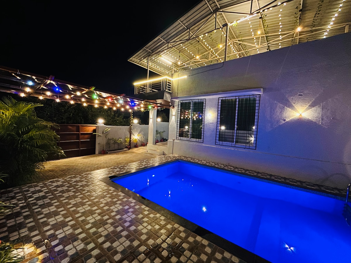 Our beautiful property is a 3 bedroom(AC) villa with private pool and unique fusion of modern Amenities, traditional design elements & antique décor giving you a memorable royal stay experience with your family. Additional 2 bedrooms available with extra charges. 24hr caretaker with expertise on authentic Maharashtrian food(Veg & Nveg) Refer customer reviews for this. Located in Sahyadri Valley with historical importance near Karjat & serene mountains on 3 sides. Tar road till villa.