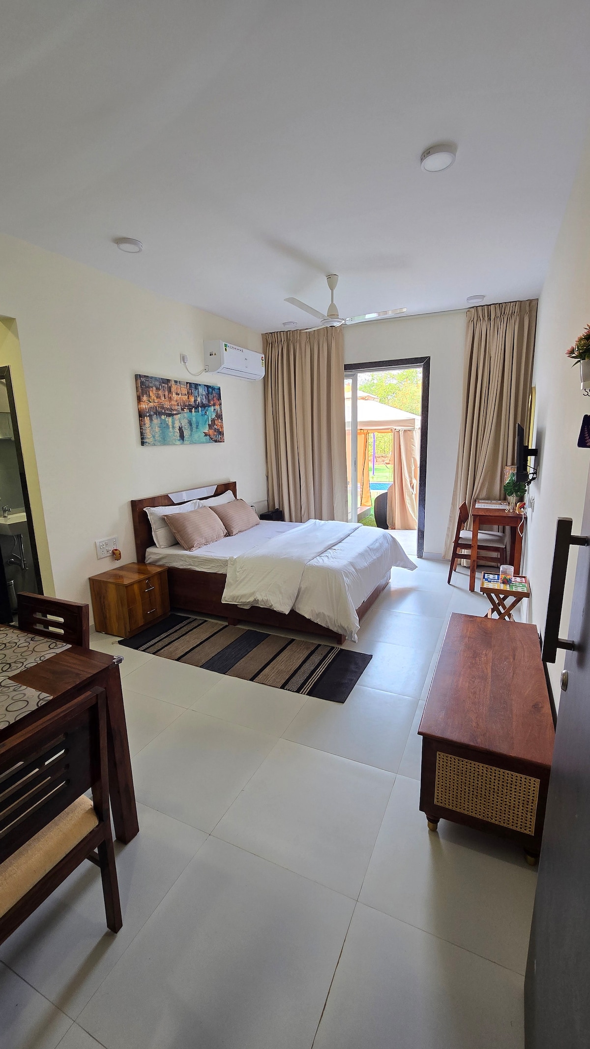 Boho Style Luxury Studio with Jacuzzi and Garden. A peaceful getaway. Fully loaded with WiFi, JBL 2.1 Home Theatre, BT Music System, Full-HD LED TV. A stylish bathroom with toiletries. Pantry with tea/coffee supplies, RO water, Microwave, Induction Hob, Fridge & s/w Toaster. Fenced garden for children. Dine in the garden with beautiful weather. Jacuzzi has hot water that can be used anytime. Common amenities on-site like swimming pool, games room, gym, mini theatre, cycling and restaurant.