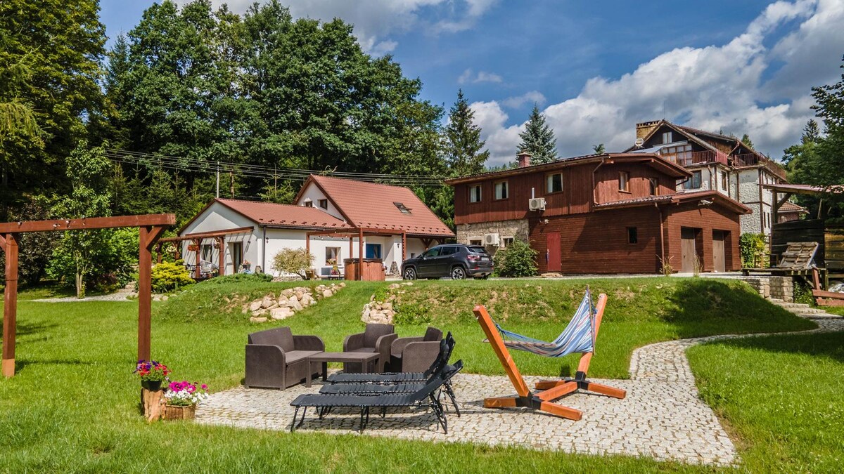 Our 3 holiday mountain lodges are directly located in the giant mountains of poland - in the middle of 2 ski areas Szklarska Poreba & Karpacz. Perfect for hiking, wintersports & nature fans. For that our lodges are perfect prepared with ski wardrobe, shoe dryer, infrared Sauna, hottub,Terrace & private parking space. Closed to us is a very famous waterfall where it is alloud to go swimming. The interior is a very cosy unique design with all modern features - WIFI, smart TV, modern kitchen, ...