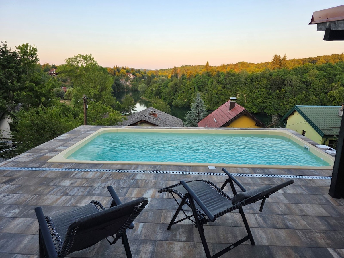 Welcome to House Bramado Discover the charm of House Bramado, a collection of three brand-new, modern studio apartments surrounded by nature, just 5 km from Entrance 1 of the National Park. Take a refreshing dip in our pool, unwind in the peaceful surroundings, and explore the breathtaking landscapes of Plitvice. If you're arriving by bus, we offer a free transfer to the National Park, ensuring a smooth and hassle-free visit. Book your stay now and experience Plitvice in the heart of nature!