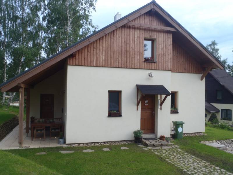 V objektu se nachazi dva apartmany(kazdy40m2)jeden v prizemi druhy v patre.V loznici je dvouluzko(160cm)V kuchyni rozkladaci gauc(160cm)V koupelne je sprchovy kout s podlahovym vytapenim, fen,rucniky,mydlo.V objektu je plne vybavena kuchyn,vcetne koreni,varna deska,trouba,mikrovlnka,mycka,rychlovarna konvice,kavovar,toustovac,topinkovac,mixer,lednice s mensim mrazakem.Satelitni televize v obyvaci mistnosti i v loznici.Pracka,vysavac,vysousec bot,lyzarna,venkovni zastresena terasa s grilem,ohniste a altan.