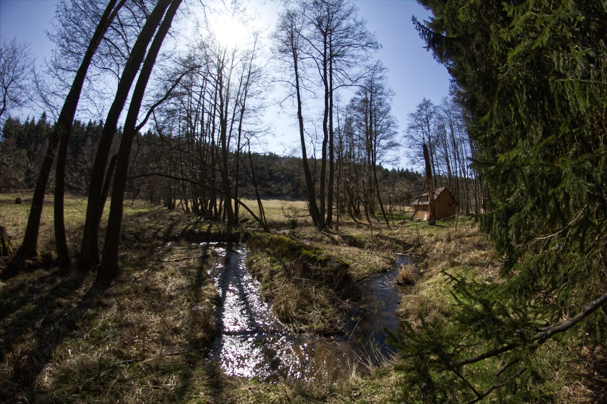 Hledáte klidné, ale dobrodružné ubytování v přírodě bez civilizace? Náš Base camp je vám k dispozici! Elektřinu ani internet tu nenajdete. BC, je naše chata na “konci světa”. Leží mezi Rybničnou a Pilou na Karlovarsku. Dřevěná chata má krbová kamna a základní vybavení. Po žebříku se dostanete do podkroví odkud můžete sledovat divoká zvířata a potok a krajinu. Před chatou je ohniště, lavičky a kamenná pec a potok. V chatě najdete vše pro zabavení se, pozorování lesa a napojení se na přírodu.