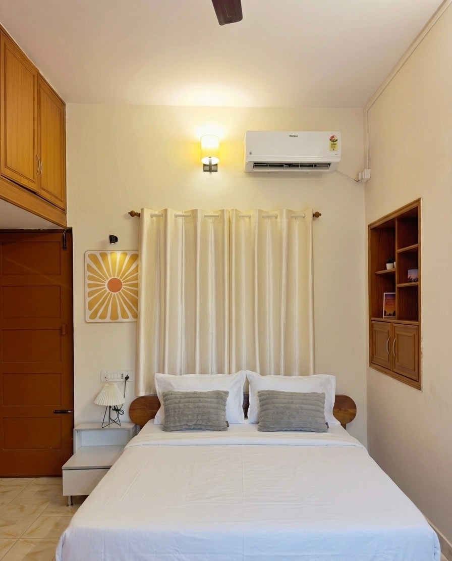 A modern home with warm wooden accents and cozy décor. Enjoy a stylish studio with plenty of natural light. Located in a central neighborhood with comfortable living area, modern furniture and private terrace. Perfect for solo traveller, couple or small families looking for comfort and convenience. Neighborhood Highlights: 🌿 Situated in a safe residential area with easy access to local market 🛍️ Close to WTC, ORION Malleswarma, ISKCON, Kuvempu metro station 🚙Well connected to main road.