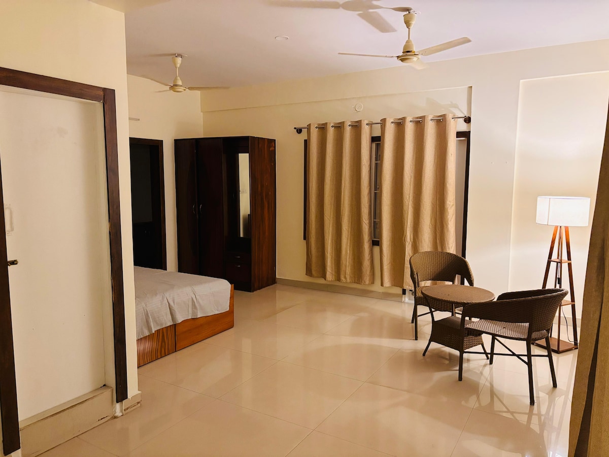 Spacious 600 square feet Designer 1BHK Suite with Private Balcony | High-Speed fibre optic Wi-Fi & Smart TV with streaming platforms, Work/Dining Desk, 24/7 power backup for uninterrupted work and comfort |Luxe King Bed & Orthopaedic Mattress ,wooden wardrobes for storage | fully equipped Kitchenette | Couch Bed in living room , Max.Occupancy 4 | Elevator access, professional housekeeping and access to paid laundry on site for long stays| Located in Central Bangalore | LGBTQIA++ Affirmative