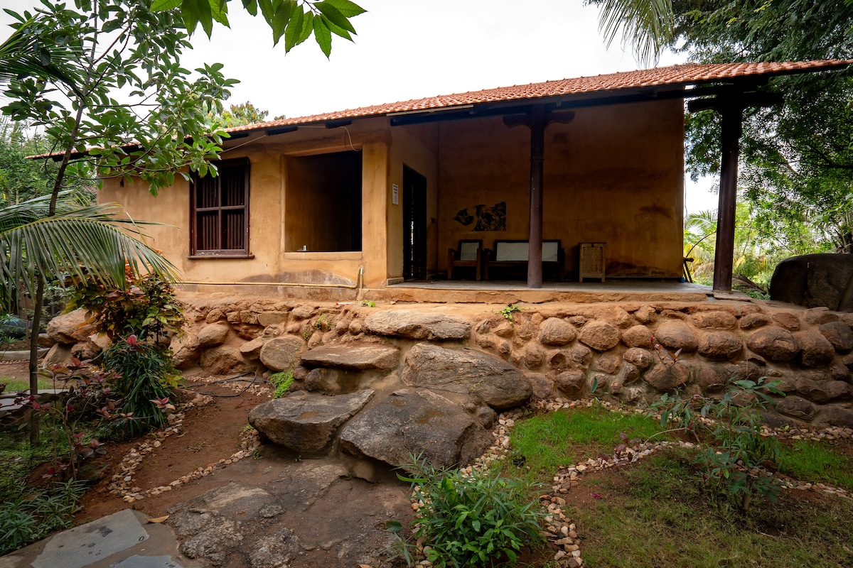 Unwind at this eco-friendly earthen cottage set in a vibrant urban garden. Featured in notable architecture magazines, it’s built with a traditional "wattle and daub" technique using soil, clay, and straw, with bamboo for structural elements, keeping it cool and comfortable even in the summer. A truly unique experience unrivalled in the garden city of Bengaluru, this property is the epitome of sustainability, and blurs the boundary between home living and nature. Less than 30 min from airport.
