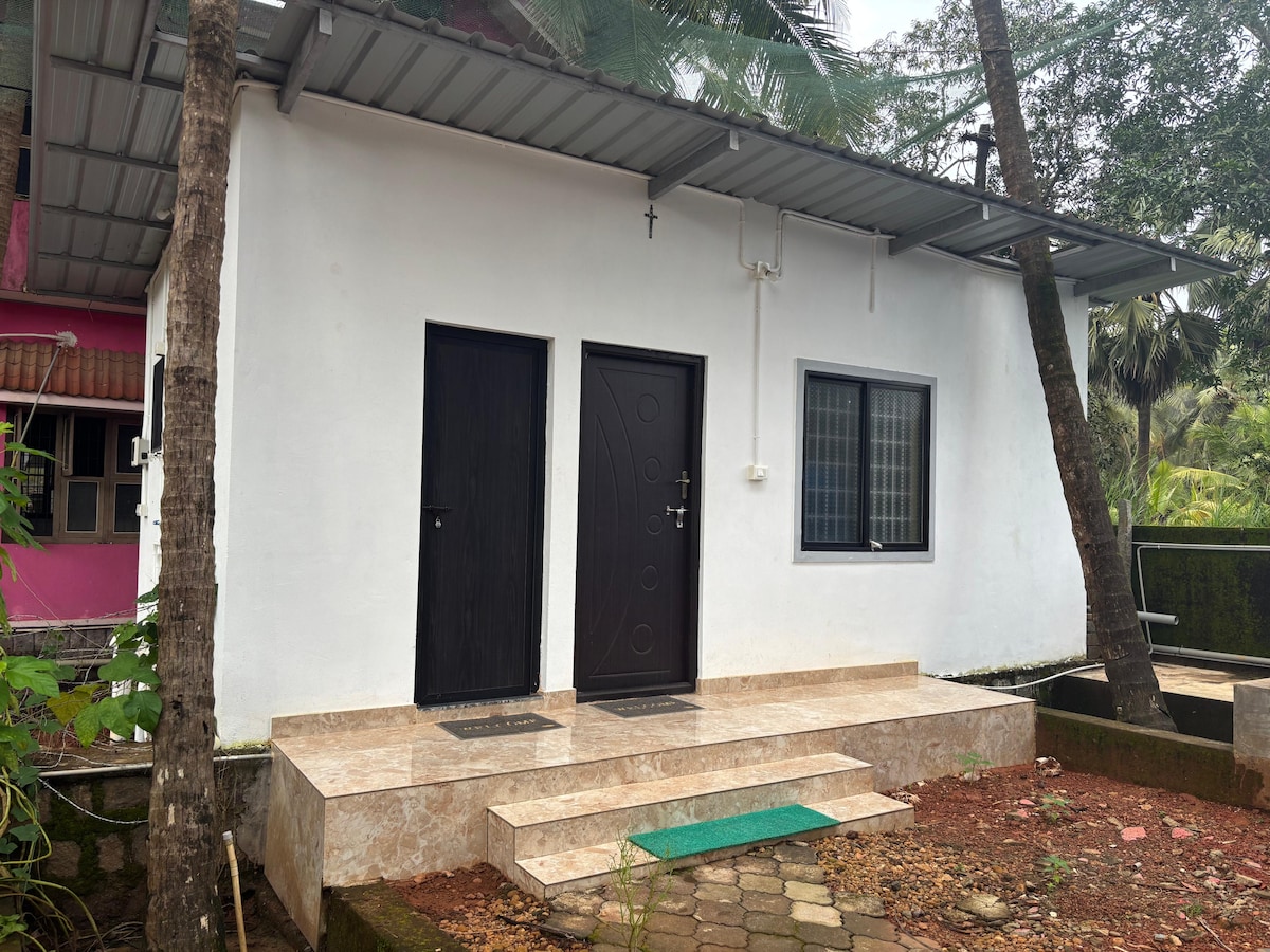 This independent studio is located on ground floor, it has private attached bathroom and kitchenette. The space opens out into a large garden, with mango and coconut trees. This property is located 1 km from the bus stop, supermarket and restaurants! It is part of a larger farm property, which has a few more Airbnb listings. AC available for extra charge: ₹300