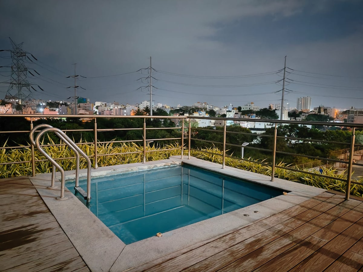Experience luxury and convenience in this stunning three-bedroom penthouse, ideally located in the heart of Bangalore. * Spacious Living Areas: Relax in the expansive seating area, * Fully Equipped Kitchen & Dining * Comfortable Bedrooms: Three beautifully bedrooms with premium linens. * Elegant Bathrooms: * Private Outdoor Terrace: Unwind in your own secluded garden space. * Terrace Pool & Garden: Take a dip in the serene pool *Fully Equipped Home Theater: Experience cinematic excellence