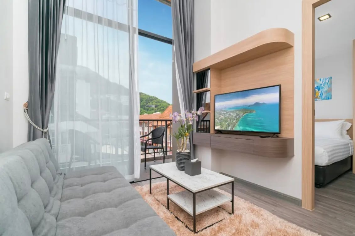 闹中取静,普吉巴东繁华黄金地段,无边双游泳池&健身房,温馨一室一厅带厨卫浴缸房间+24小时保安