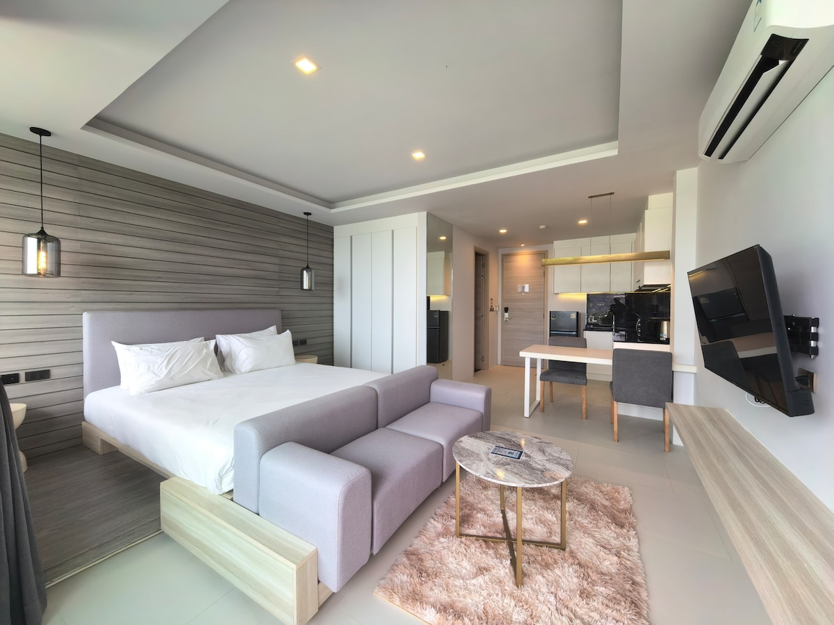 这是一间位于卡伦(Karon)海滩附近的全新现代公寓,距离海滩仅约 800 米(步行 10 分钟),位置优越,生活便利。这里是普吉岛西南岸最受欢迎、又相对宁静的度假区域之一,非常适合想要放松、享受海岛风情的旅客。 公寓面积约 35 平方米,为单间设计,风格现代简约,配有 高速无线网络,入住后水、电、网络均已包含,无需额外付费。 房间配备齐全的厨房设施——冰箱、微波炉、电磁炉等,可自行烹饪。 入住时我们还贴心准备了矿泉水与一些洗漱用品,让您拎包即可入住。 公寓楼设施完善,设有 两座屋顶无边泳池、健身房 以及 餐厅,您可以在泳池边欣赏卡伦海滩的壮丽景色,享受惬意的度假时光。 📍 位置与周边景点 🚶♀️ 卡伦海滩:约 800 米,步行 10 分钟 🚗 卡塔海滩:约 5 分钟车程(2.5 公里) 🚗 芭东海滩:约 10 分钟车程(6 公里) 🚗 查龙寺:约 15 分钟车程 🚗 大佛 :约 20 分钟车 🚗 普吉镇:约 25 分钟车程 区域内餐厅便利店、按摩店和夜市齐全,生活与娱乐十分方便。