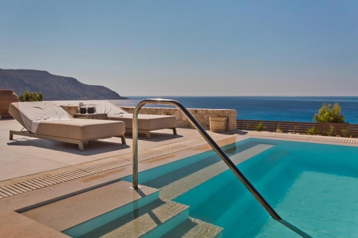 Crystal Chateau:This location is one of a kind, with a panoramic view of the Aegean Sea with absolutely no obstructions!This majestic gem of a contemporary home is designed for the ultimate in comfort, relaxation, and convenience. 3 bedrooms with individual bathroom in each room, kitchen and living room with an extra bathroom.kitchen housed with granite floors and countertops, top-of-the-line appliances, two ovens, one microwave oven, two sinks, refrigerator, and dishwasher.