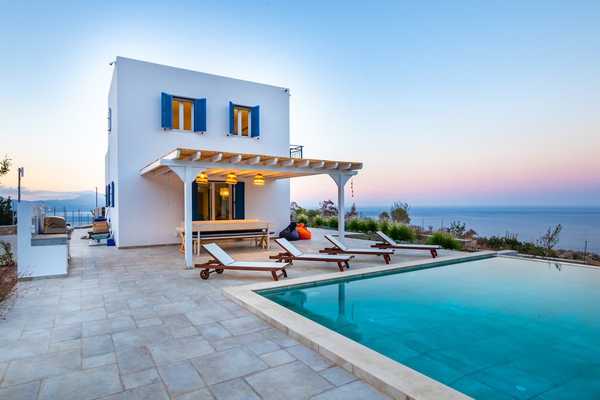 ***New Build!! *** Welcome to Casa Minza; a luxurious villa located on the east coast of Karpathos - infinity pool and breathtaking sea views. A 15-minute walk through the pine trees below the house brings you to a choice of two beautiful, unspoilt beaches. A short drive (or 20-min walk) away is Kyra Panagia, a gorgeous bay with sunbeds and tavernas. The terrace enjoys a panoramic view of the Aegean Sea - come for peace and tranquility or hiking, cycling, snorkelling, water sports and yoga!