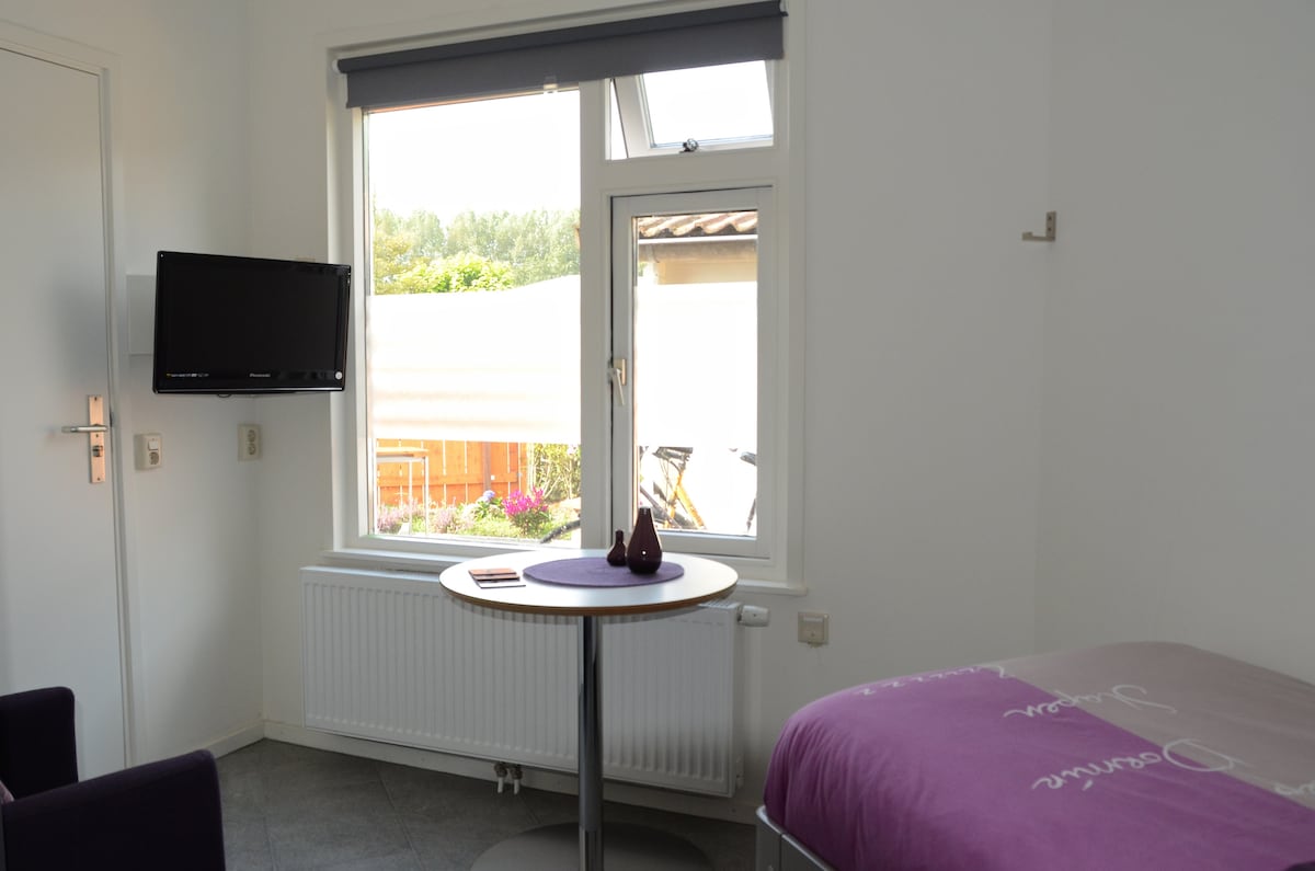 De gast suite is gelegen in de achtertuin van ons perceel, en is te bereiken via een zijpoort van ons huis. De studio heeft 2 eenpersoonsbedden(80-200) en een gezellig zitje met 2 stoelen. TV aanwezig. Er is een keukentje aanwezig waarin zich een magnetron, Nespresso apparaat, waterkoker en koelkastje bevinden. Het is niet mogelijk om uitgebreid te koken. Er staat een kleine eettafel met 2 stoelen. Voor de Guesthouse heeft u een klein buitenterras met 2 zitplekken.