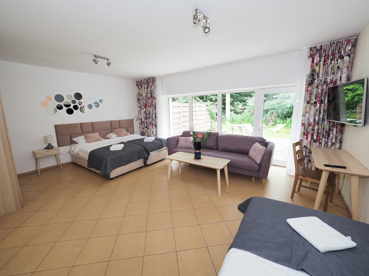 Stylowo urządzony apartament z tarasem, znajdujący się na parterze z widokiem na las. Oddzielne wejście. Dostęp wspólnej sali kominkowej oraz pokoju zabaw. Altanka w ogrodzie. Dostęp do grilla. Miejsce parkingowe. W łazience: kabina prysznicowa, podstawowe kosmetyki, ręczniki. W kuchni: czajnik, płyta indukcyjna, zmywarka, lodówka, przybory kuchenne i zastawa. Smart TV oraz Wi-Fi. Lokalizacja w Lesie, kameralny obiekt dla rodzin z dziećmi oraz par lubiących wypoczynek.