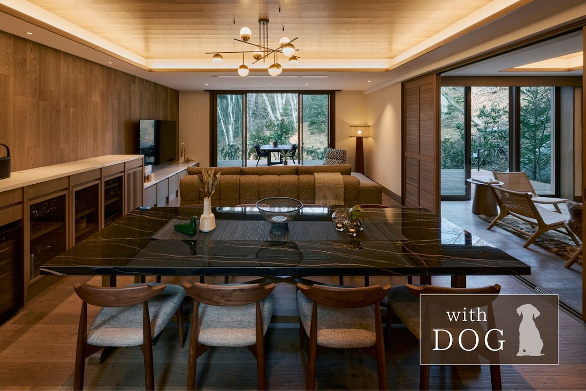 ★ Luxury Villa in Karuizawa Highlands ★ Exclusive villa at 1000m elevation on 1070㎡ property. 3BR+study for up to 13 guests. ● Pet Paradise 500㎡ fenced dog run, indoor pet toilet, amenities included. ● Premium Comfort High insulation, floor heating, AC, Serta double beds. Kitchen, WiFi, Netflix, BBQ, EV charger, 3 parking. ● Prime Location 15min to Old Karuizawa, 10min to Hoshino, 12min to station. Enjoy starlit dinners, misty mornings, and bonfire gatherings with family, friends, and pets.