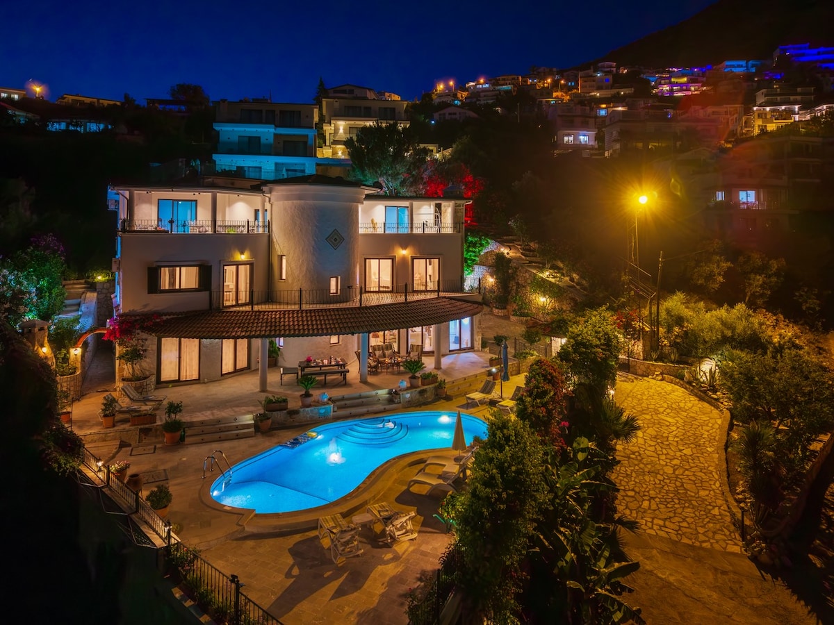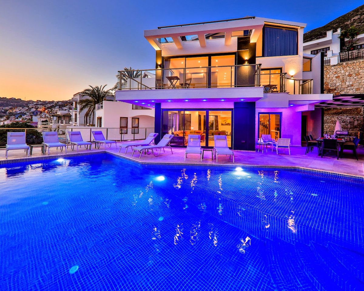 This stunning 4 bed/4 bath villa with a heated pool* & jacuzzi* offers breathtaking views from every corner and is only 5 minutes walking distance from the beach . Recognized with 2024 top design award by the Turkish Architecture Board, features generously sized pool, panoramic windows, luxury marble bathrooms, sauna, gym and several terraces. Located in a Kisla, a high-in-demand upscale area in Kalkan, provides a peaceful & relaxing environment. *small surcharge for heating upon request
