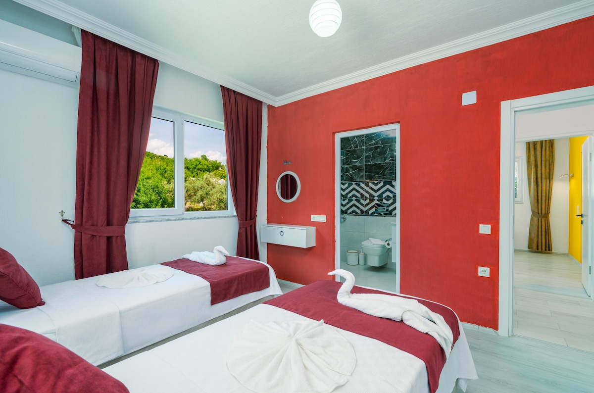 This stylish and spacious boutique style villa is nestled into the exclusive hillside of Komurluk area in Kalkan, Turkey. In just 5 minutes walk you will reach Mediterranean sea and beach clubs. Walk to Kalkan town will take only 10 minutes. In an elevated position overlooking Kalkan bay and the harbour, you can enjoy peace and tranquility with beautiful views and sunsets whilst being just a short stroll into bustling Kalkan with its fabulous roof top restaurants, bars and up market shops.