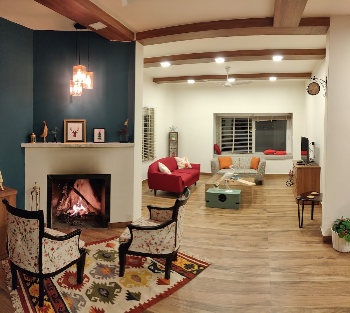 Surrounded by pine-covered slopes, this villa is designed for those who find joy in quiet luxury and thoughtful details! Beneath a sloped ceiling with exposed wooden beams, the indoor bar area is ideal for leisurely evenings with its dark wood counter, cushioned black stools, vibrant sofa and AC for added comfort. The spacious terrace offers breathtaking 360° hill views, bordered by colorful flowers, while the lounge den features an L-shaped sofa and a uniquely shaped wooden coffee table.